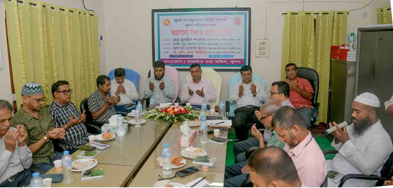 নিজস্ব প্রতিনিধি:: খুলনা আঞ্চলিক তথ্য অফিসের আয়োজনে জুলাই গণ-অভ্যুত্থানের বর্ষপূতি উপলক্ষ্যে জুলাই শহীদদের স্মরণে আলোচনা সভা ও দোয়া মাহফিল সোমবার সকালে অফিসের সংবাদকক্ষে অনুষ্ঠিত হয়। এতে প্রধান অতিথি ছিলেন খুলনার অতিরিক্ত বিভাগীয় কমিশনার (সার্বিক) মোঃ হুসাইন শওকত।