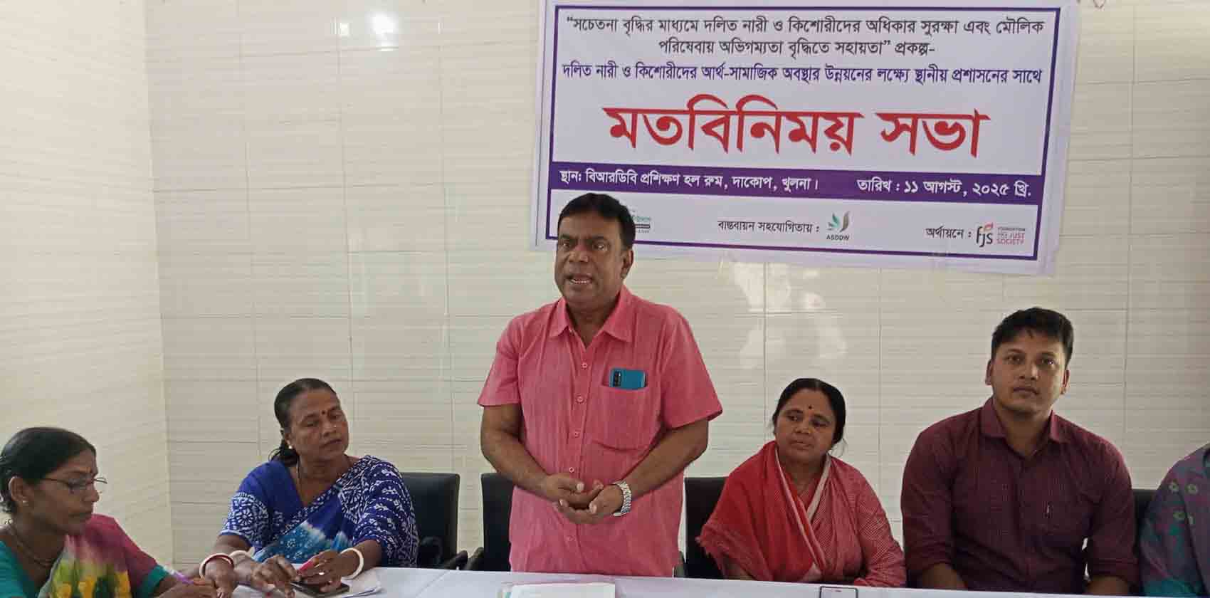 দাকোপ প্রতিনিধি:: দাকোপে দলিত নারী ও কিশোরীদের আর্থ-সামাজিক অবস্থার উন্নয়নের লক্ষ্যে স্থানীয় প্রশাসনের সাথে মতবিনিময় সভা অনুষ্ঠিত হয়েছে। বে-সরকারী উন্নয়ন সংস্থা নাগরিক উদ্যোগের বাস্তবায়নে এএসডিডিডাব্লু এর সহযোগীতায় এবং এফজেএস এর অর্থায়নে সোমবার সকাল ১০ টায় উপজেলা বিআরডিবি প্রশিক্ষণ হলরুমে এএসডিডিডাব্লু নির্বাহী পরিচালনাক লিপিকা বৈরাগীর সভাপতিত্বে সভা অনুষ্ঠিত হয়। সভায় অতিথি হিসেবে বক্তৃতা করেন উপজেলা প্রাণিসম্পদ কর্মকর্তা ডাঃ বঙ্কিম কুমার হালদার, উপজেলা মাধ্যমিক শিক্ষা কর্মকর্তা মোঃ সোহেল হোসেন। অন্যান্যের উপস্থিত ছিলেন সাবেক কমিশনার কনিকা বৈরাগী, সংগঠণের চুনকুড়ি সভানেত্রী টুম্পা গাইন, খাটাইল সভানেত্রী মলিনা বিশ^াসসহ দলিত নারী ও কিশোরী প্রতিনিধিবৃন্দ।