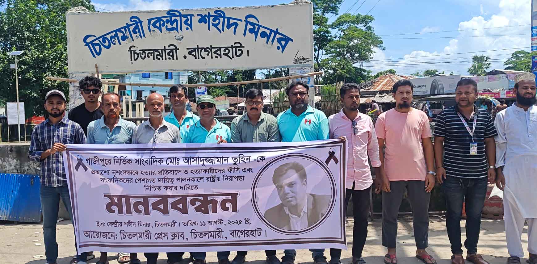 বাগেরহাট প্রতিনিধি:: সাংবাদিক আসাদুজ্জামান তুহিনকে নৃশংসভাবে হত্যার প্রতিবাদে ও দোশীদের ফাঁসির দাবিতে মানববন্ধন করেছে বাগেরহাটের চিতলমারী প্রেসক্লাব এর সংবাদকর্মী ও এলাকার সুধীজন। সোমবার (১১আগষ্ট) সকালে চিতলমারী কেন্দ্রীয় শহীদ মিনার চত্বরে এই মনববন্ধন অনুষ্টিত হয়।