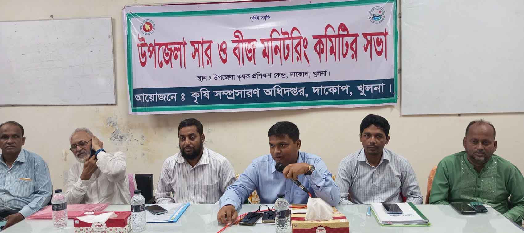 দাকোপ প্রতিনিধি:: দাকোপে উপজেলা সার ও বীজ মনিটরিং কমিটির সভা অনুষ্ঠিত হয়েছে। উপজেলা কৃষি সম্প্রসারণ অদিপ্তরের আয়োজনে বৃহস্পতিবার বেলা ১১ টায় উপজেলা কৃষি প্রশিক্ষণ হল রুমে উপজেলা কৃষি কর্মকর্তা কৃষিবিদ শফিকুল ইসলামের সভাপতিত্বে অনুষ্ঠিত সভায় প্রধান অতিথির বক্তৃতা করেন উপজেলা নির্বাহী অফিসার মোঃ আসমত হোসেন। বিশেষ অতিথির বক্তৃতা করেন উপজেলা কৃষি সম্প্রসারণ কর্মকর্তা মোঃ কামরুল হাসান, পানখালী ইউপি চেয়ারম্যান শেখ ছাব্বির আহম্মেদ, দাকোপ প্রেসক্লাব সভাপতি গোবিন্দ বিশ^াস, নবনিবাচিত সভাপতি মোঃ শামীম হোসেন প্রমুখ। সভায় উপজেলা সার ও বীজ ডিলার বৃন্দ ও কৃষি অধিদপ্তরের কর্মকর্তা ও সাংবাদিক বৃন্দ উপস্থিত ছিলেন।