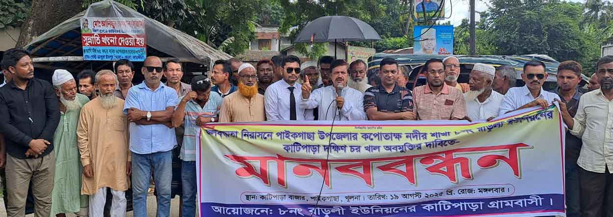 পাইকগাছা (খুলনা) প্রতিনিধি:: পাইকগাছায় কপোতাক্ষ নদের শাখা কাঠিপাড়া দক্ষিণ চর খাল উম্মুক্ত করার দাবিতে এলাকাবাসীর উদ্যোগে মানববন্ধন অনুষ্ঠিত হয়েছে। মঙ্গলবার (১৯ আগষ্ট) সকালে কাঠিপাড়া বাজারে মেইন সড়কে এ মানববন্ধন অনুষ্ঠিত হয়।