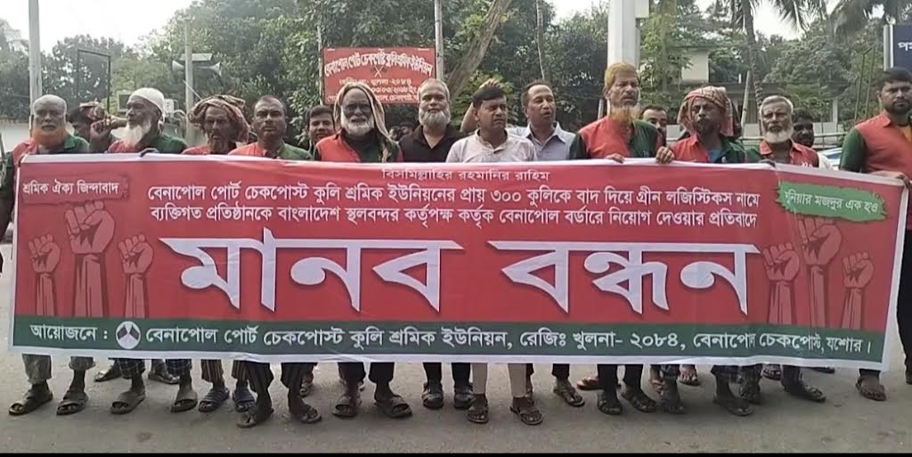 বেনাপোল প্রতিনিধি:: যশোরের শার্শা উপজেলার বেনাপোল স্থলবন্দরের চেকপোস্টে কুলি শ্রমিক ইউনিয়নের প্রায় ৩০০ কুলি শ্রমিককে বাদ দিয়ে নতুন করে গ্রীন লজিস্টিকস যাত্রী সেবা নামে একটি সরকারি প্রতিষ্ঠানকে বাংলাদেশ স্থলবন্দর কর্তৃপক্ষ কর্তৃক বেনাপোল চেকপোস্ট প্যাসেঞ্জার টার্মিনালে এবং কাষ্টমস হাউজে লাগেজ বহনে নিয়োগ দেওয়ার প্রতিবাদে তৃতীয় দিনের মতো মানববন্ধন ও বিক্ষোভ মিছিল অনুষ্ঠিত হয়েছে।
