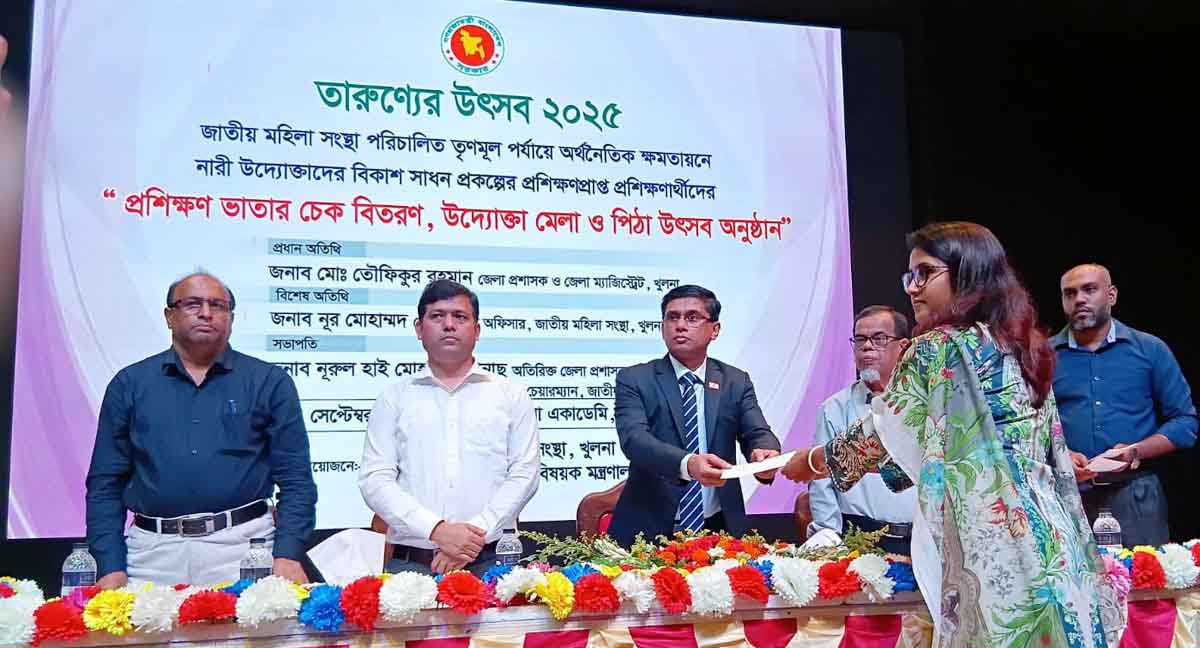 নিজস্ব প্রতিনিধি:: তারুণ্যের উৎসব উপলক্ষ্যে খুলনা জাতীয় মহিলা সংস্থা পরিচালিত তৃণমূল পর্যায়ে অর্থনৈতিক ক্ষমতায়নে নারী উদ্যোক্তাদের বিকাশ সাধন প্রকল্পের প্রশিক্ষণপ্রাপ্ত প্রশিক্ষণার্থীদের মাঝে ভাতার চেক ও সনদপত্র বিতরণ, উদ্যোক্তা মেলা এবং পিঠা উৎসব সোমবার দুপুরে খুলনা জেলা শিল্পকলা একাডেমি অডিটোরিয়ামে অনুষ্ঠিত হয়। অনুষ্ঠানে প্রধান অতিথি ছিলেন খুলনার জেলা প্রশাসক মোঃ তৌফিকুর রহমান।