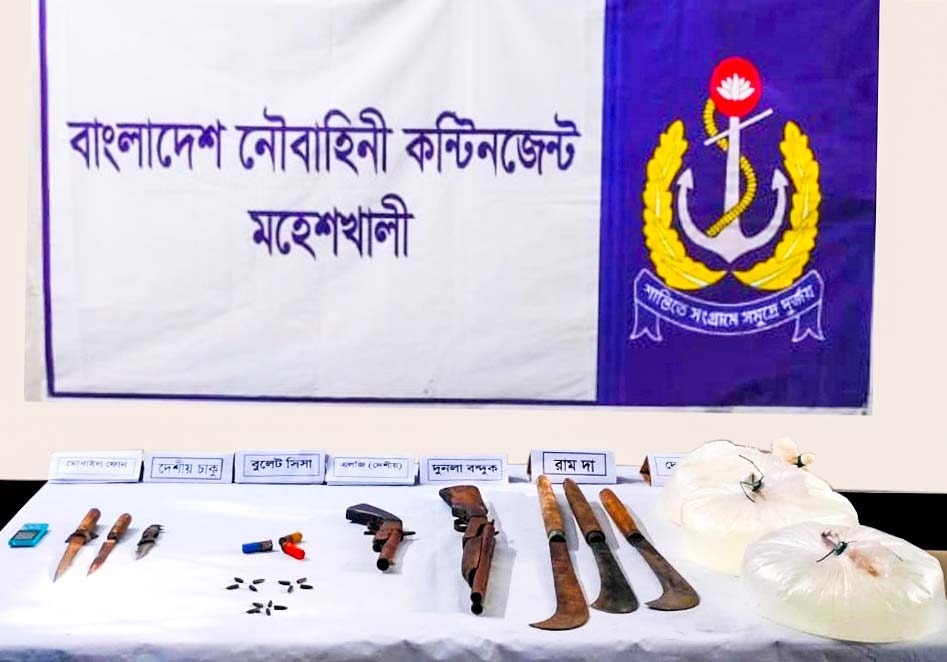 গোপন সংবাদের ভিত্তিতে গতকাল দিবাগত রাতে কক্সবাজারের মহেশখালী উপজেলার বড় মহেশখালী ইউনিয়নের দেবেঙ্গা পাড়ায় একটি বিশেষ অভিযান পরিচালনা করে নৌবাহিনী কন্টিনজেন্ট মহেশখালী। অভিযানকালে মহেশখালীর চিহ্নিত সন্ত্রাসী আনসারুল করিম ও নুর আলমকে তাদের নিজ নিজ বাড়ি হতে আটক করা হয়। এ সময় তলাশি করে ১টি এলজি, ১ টি দু-নলা দেশীয় বন্দুক, ৬ টি ধারালো অস্ত্র, ১৩ রাউন্ড বুলেট সিসা, ৩ রাউন্ড তাজা কার্তুজ ও ৫০০ লিটার দেশীয় মদ জব্দ করা হয়। থানা সূত্রে জানা যায়, আটককৃত সন্ত্রাসীরা মহেশখালী থানার অস্ত্র, মাদক, চুরি, হত্যা ও মানবপাচারসহ একাধিক মামলার আসামি। পরবর্তীতে জব্দকৃত মাদক, অস্ত্র এবং সন্ত্রাসিদের আইনানুগ ব্যবস্থা গ্রহণের নিমিত্তে মহেশখালী থানায় হস্তান্তর করা হয়।