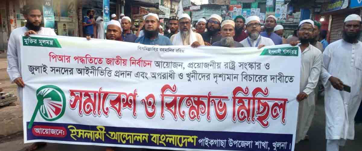 পাইকগাছা (খুলনা) প্রতিনিধি::জাতীয় নির্বাচনে পিআর পদ্ধতি চালু, রাষ্ট্র সংস্কার, জুলাই সনদের আইনী ভিত্তি প্রদান এবং অপরাধী ও খুনিদের দৃশ্যমান বিচারের দাবিতে পাইকগাছায় বিক্ষোভ মিছিল ও সমাবেশ করেছে ইসলামী আন্দোলন বাংলাদেশ।