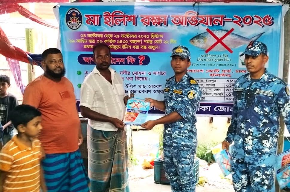 এ উপলক্ষ্যে আজ ০২ অক্টোবর ২০২৫ তারিখ বৃহস্পতিবার দুপুর ১২ টা থেকে বিকাল ৫ টা পর্যন্ত কোস্ট গার্ড স্টেশন চাঁদপুর কর্তৃক চাঁদপুর নদী তীরবর্তী এলাকায় স্থানীয় জনগণ, জেলে ও মৎস্য ব্যবসায়ীদের মাঝে জনসচেতনতা বৃদ্ধির লক্ষ্যে লিফলেট বিতরণ, মাইকিংসহ নানাভাবে প্রচারণা চালিয়ে মা ইলিশ সংরক্ষণের গুরুত্ব এবং প্রযোজ্য আইন সম্পর্কিত তথ্য প্রদানের মাধ্যমে সচেতনতা বৃদ্ধি করা হয়। উক্ত জনসচেতনতামূলক সভায় জেলা প্রশাসক, পুলিশ সুপার, জেলা মৎস্য কর্মকর্তা, সহকারী কমিশনার ভূমি সহ অন্যান্য কর্মকর্তা ও সদস্যবৃন্দরা উপস্থিত ছিলেন।