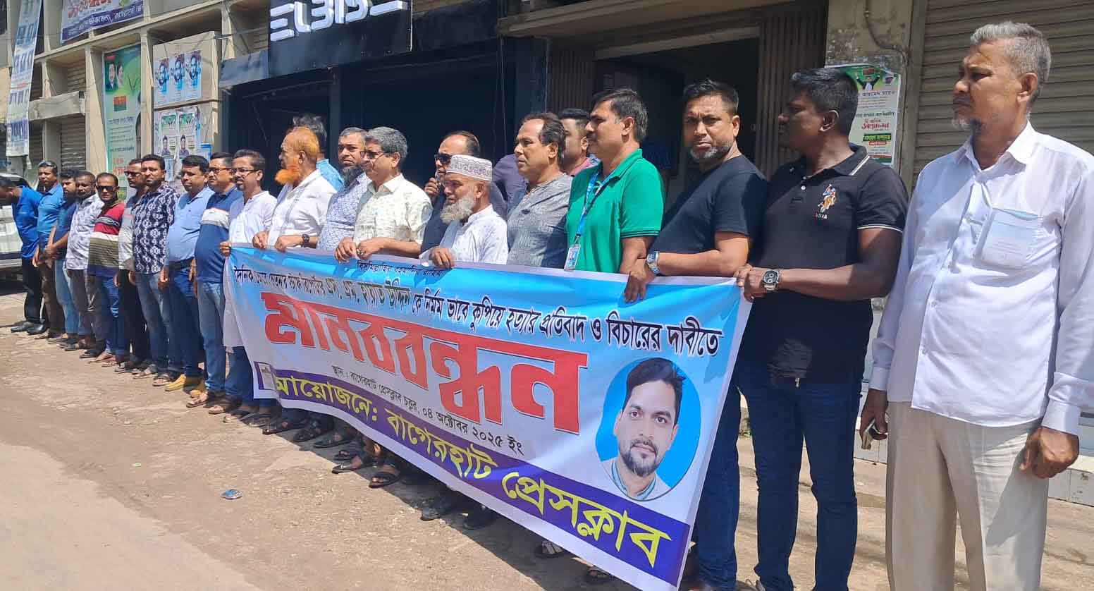শনিবার (৪ অক্টোবর ২০২৫) দুপুরে বাগেরহাট প্রেসক্লাব চত্বরে এ মানববন্ধনের আয়োজন করে বাগেরহাট প্রেসক্লাব।