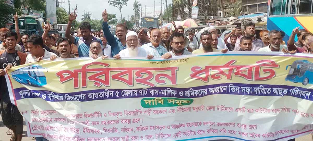 ধর্মঘটের ডাক দিয়েছে। পথসভায় বক্তৃতা করেন বাগেরহাট আন্তঃজেলা বাস মিনিবাস কোচ ও মাইক্রোবাস মালিক সমিতির সিনিয়র সহ-সভাপতি শাহজাহান মিনা, সহ-সভাপত জিয়াউদ্দিন, সাধারণ সম্পাদক মো. শহিদুল ইসলাম, যুগ্ম সাধারণ সম্পাদক আবুল কালাম আজাদ, অর্থ সম্পাদক মীনা মতিউর রহমান, সহ সম্পাদক মোঃ আঃ খালেক মোড়ল, সড়কসম্পাদক নাছিম আহমেদ শাকিল প্রমূখ।