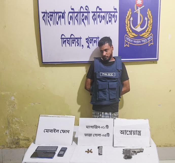 নিজস্ব প্রতিবেদক:: দেশের সার্বিক নিরাপত্তা নিশ্চিতকরণের লক্ষ্যে সন্ত্রাস ও অপরাধমূলক কার্যক্রম দমনে দায়িত্বপ্রাপ্ত এলাকাসমূহে নৌবাহিনী নিয়মিত অভিযান পরিচালনা করে আসছে। আজ সোমবার (৬ অক্টোবর) গোপন তথ্যের ভিত্তিতে খুলনা জেলার দিঘলিয়া উপজেলাস্থ ফরমাশেখানা এলাকায় বাংলাদেশ নৌবাহিনী ও পুলিশ যৌথ অভিযান পরিচালনা করে। উক্ত অভিযানে সন্ত্রাসী রিপনকে আটক করা হয়। এ সময় আটককৃত সন্ত্রাসীর বাড়ি তল্লাশী করে ০১টি ৭.৬মি:মি: পিস্তল, ০৫ রাউন্ড তাজা গোলা, ০১টি ম্যাগাজিন এবং ০৩টি মোবাইল উদ্ধার করা হয়। থানা সূত্রে জানা যায়, আটককৃত সন্ত্রাসী খুন, ডাকাতি, ছিনতাই, অপহরণ ও মাদক মামলার ওয়ারেন্টভুক্ত শীর্ষ আসামি। অভিযান শেষে আইনানুগ ব্যবস্থা গ্রহণের নিমিত্তে জব্দকৃত অস্ত্র এবং সন্ত্রাসীকে দিঘলিয়া থানায় হস্তান্তর করা হয়।