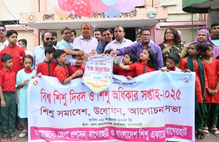 বাগেরহাট প্রতিনিধি:: শিশুর কথা শুনবো আজ,শিশুর জন্য করব কাজ" এই প্রতিপাদ্যের আলোকে মহিলা ও শিশু বিষয়ক মন্ত্রণালয়ের নির্দেশনায়,জেলা প্রশাসন ও বাংলাদেশ শিশু একাডেমি বাগেরহাট জেলা কার্যালয়ের উদ্যোগে ০৬ (অক্টোবর) সোমবার সকালে বিশ্ব শিশু দিবস ও শিশু অধিকার সপ্তাহ ২০২৫ এর শুভ উদ্বোধন করা হয়। বাগেরহাট জেলা প্রশাসকের কার্যালয় চত্বরে বেলুন ও ফেস্টুন উড়িয়ে সপ্তাহ ব্যাপী কর্মসূচির শুভ উদ্বোধন করেন সমগ্র অনুষ্ঠানের প্রধান অতিথি জেলা প্রশাসক আহমেদ কামরুল হাসান। এরপরে বিশ্ব শিশু দিবস ও শিশু অধিকার সপ্তাহ উপলক্ষে জেলা প্রশাসকের সম্মেলন কক্ষে অনুষ্ঠিত হয় আলোচনা সভা। অতিরিক্ত জেলা প্রশাসক( সার্বিক) মমিনুর রহমান এঁর সভাপতিত্বে অনুষ্ঠানে স্বাগত বক্তব্য প্রদান করেন জেলা শিশু বিষয়ক কর্মকর্তা সেখ আসাদুর রহমান। উক্ত অনুষ্ঠানে অন্যান্যদের মধ্যে অতিথি হিসেবে উপস্থিত ছিলেন যুব উন্নয়ন অধিদপ্তরের উপ-পরিচালক শেখ আব্দুল কাদের ,জেলা ক্রীড়া সম্পাদক হুসাইন আহমেদ ,বাগেরহাট প্রেসক্লাবের সভাপতি মোঃ কামরুজ্জামান, ডাঃ শেখ রিয়দুজজকমান। আলোচনা সভা শেষে শিশু অধিকার সপ্তাহ ২০২৫, উপলক্ষে বিভিন্ন শিক্ষা প্রতিষ্ঠান ও শিশু একাডেমীর ছাত্র-ছাত্রীদের সমন্বয়ে এক সাংস্কৃতিক অনুষ্ঠান অনুষ্ঠিত হয়।