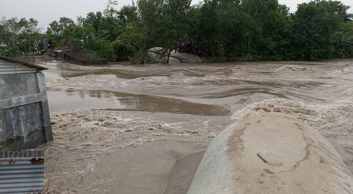 ৮ অক্টোবর বুধবার সরজমিনে ঘুরে এবং ক্ষতিগ্রস্ত পরিবারের সাথে কথা বলে জানাযায় , মঙ্গলবার গভীর রাতে খর¯্রােতা ঢাকি নদীর প্রবল জোয়ার তোড়ে উপজেলার পাউবোর ৩১নং পোল্ডারের ৭নং তিলডাঙ্গা ইউনিয়নের বটবুৃনিয়া বাজারের পশ্চিম পাশে হরি মন্দিরের সামনে পাউবো’র বেড়িবাঁধের প্রায় একশত মিটার বাঁধ ঢাকি নদীতে সম্পূর্ণ ভাবে বিলীন হয়েছে। বাঁধ ভেঙ্গে ক্ষতিগ্রস্থ হওয়া রবেন বালা, সঞ্জিত বালা, তারাপদ বালা, প্রদীপ বালা,সুরঞ্জন বালা, সঞ্জয় সরদারসহ অনেকে তাদের বসতঘর বাড়ি ও নানা স্থাপনা রক্ষার্থে তা ভেঙ্গে অন্যত্র সরিয়ে নিতে দেখা গেছে। ভেঙ্গে যাওয়া বাঁধটি এখনো পর্যন্ত আটকানো সম্ভব না হয়নি। ভেঙ্গে যাওয়া বাঁধ দিয়ে নদীর জোয়ারের পানি লোকালয়ে ঢুকে পড়ায় তলিয়ে গেছে কৃষকের হাজারো হেক্টর আমন ফসলের জমি। এ সময় স্থানীয় শতাধিক বসতঘর বাড়ির ভিতরে পানি ঢুকে পড়তে দেখা গেছে। বাঁধটি এখনো পর্যন্ত আটকানো সম্ভব না হওয়ায় গ্রামবাসীর আতংঙ্ক কাটছে না।