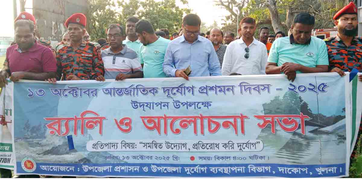 দাকোপ(খুলনা) প্রতিনিধি:: ‘সমন্বিত উদ্যোগ, প্রতিরোধ করি দুর্যোগ’ প্রতিপাদ্য বিষয়কে সামনে রেখে দাকোপে আন্তর্জাতিক দুর্যোগ প্রশমন দিবস পালন উপলক্ষ্যে র্যালি ও আলোচনা সভা অনুষ্ঠিত হয়েছে। দাকোপ উপজেলা প্রশাসন ও উপজেলা দুর্যোগ ব্যবস্থাপনা বিভাগের আয়োজনে সোমবার বিকাল ৪ টায় উপজেলা পরিষদ মিলায়তনে উপজেলা নির্বাহী অফিসার মোঃ আসমত হোসেনের সভাপতিত্বে সভা অনুষ্ঠিত হয়। অনুষ্ঠানে সহযোগীতা করেন বে-সরকারী উন্নয়ন সংস্থা জেজেএস, সুশীলন, নবলোক, কারিতাস, উত্তরন, হীড বাংলাদেশ, ব্যাক, আদ্-দ্বীন, ফেন্ডশীপ, আশার প্রদীপ, কমপ্রশন,সিপিপি। সভায় স্বাগত বক্তৃতা করেন উপজেলা প্রকল্প বাস্তবায়ন কর্মকর্তা মোঃ শহিদুল ইসলাম। বিশেষ অতিথির বক্তৃতা করেনা উপজেলা জনস্বাস্থ্য প্রকৌশলী দপ্তরের উপ-সহকারী প্রকৌশলী আব্দুল্লাহ আল মাহামুদ, উপজেলা মেরিন ও ফিশারী কর্মকর্তা বিপুল কুমার দাস, দাকোপ প্রেসক্লাব সভাপতি মোঃ শামীম হোসেন,ভারপ্রাপ্ত প্রধান শিক্ষক বিকাশ চন্দ্র হালদার, উপজেলা ফায়ার সার্ভিস ও সিভিল ডিফেন্স ইনচার্জ মোঃ আবুল বাসার, উপজেলা সিপিপি টিম লিডার দেবাশিষ ঢালী, এনজিও প্রতিনিধি মোঃ সোহেব হোসেন, ইকবাল হোসেন, উপজেলা প্রকল্প বাস্তবায়ন অফিস সহকারী মোঃ আতাউর রহমান প্রমুখ। সভাশেষে একটি বর্নাঢ্য র্যালি চালনা পৌরসভার প্রধান প্রধান সড়ক প্রদক্ষিণ করে।