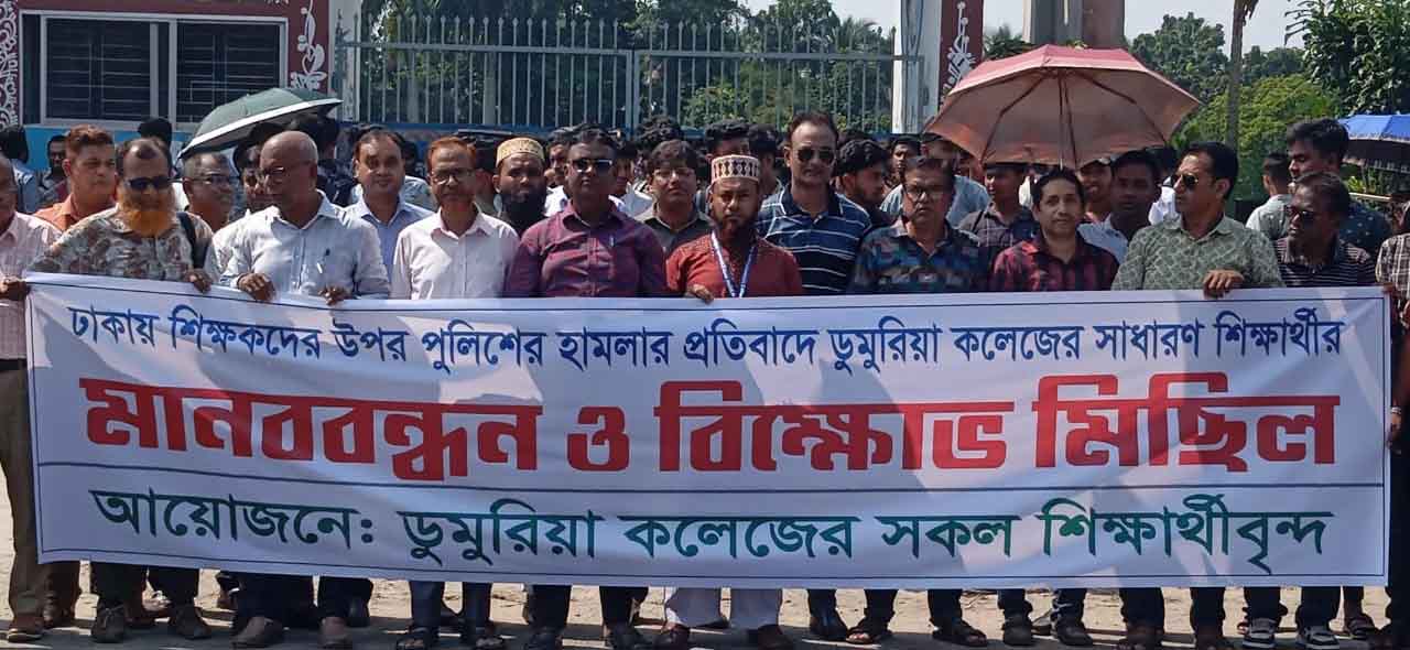 অরুন দেবনাথ ডুমুরিয়া প্রতিনিধি:: খুলনার ডুমুরিয়া ডিগ্রি কলেজের প্রধান গেটের সামনে খুলনা সাতক্ষীরা মহাসড়কে আজ সকাল ১০টায় ঢাকায় শিক্ষকদের উপর সাম্প্রতিক পুলিশের হামলার প্রতিবাদে এক মানববন্ধন অনুষ্ঠিত হয়েছে। এতে কলেজের শিক্ষক, শিক্ষার্থীসহ অংশগ্রহণ করেন।এসম উপস্থিত ছিলেন, ভারপ্রাপ্ত অধ্যক্ষ ডঃ ফেরদৌস খান, উপাধ্যক্ষ বিষ্ণুপদ মণ্ডল , সহঃ অধ্যাপক মোঃ নূরুল ইসলাস খান,অধ্যাপক মোজাম্মেল হোসেন, অধ্যাপক শিশির কুমার সিংহ,অধ্যাপক শেখকামরুজ্জান,সহ:অধ্যাক্ষ মহিদুজ্জামাব গাজী, সহঃ অধ্যাপক মোঃ আচ্ছাদুর রহমান,সহঃ অধ্যাপক মোঃ বকুল হোসেন,সহঃ মাগছুরা খাতুন, সহঃ অধ্যাপক তানজিনা আক্তার, সহঃ অধ্যাপক চন্দনা রানী, সহঃ অধ্যাপক সিনিদ্ধা বেগম, সহঃঅধ্যাপক সফিকুল ইসলাম, সহঃ অধ্যাপক বিধু ভুষন সরকার সহ প্রমুখ।মানববন্ধনে বক্তারা বলেন, দেশের শিক্ষক সমাজ জাতি গঠনের কারিগর। তাদের উপর অন্যায়ভাবে হামলা চালানো শুধু লজ্জাজনক নয়, এটি শিক্ষাব্যবস্থার প্রতি চরম অবমাননা। শিক্ষকরা সবসময় শান্তিপূর্ণ উপায়ে তাদের দাবি-দাওয়া তুলে ধরেন, কিন্তু সাম্প্রতিক ঘটনাটি পুলিশি বর্বরতার এক দৃষ্টান্ত স্থাপন করেছে বলে অভিযোগ করেন বক্তারা।