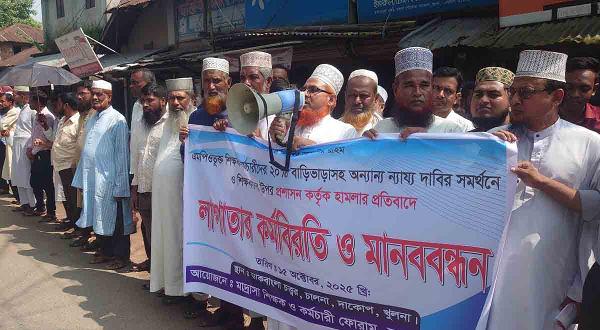 (১৫ অক্টোবর) বুধবার বেলা ১১টায় উপজেলা সদর চালনা ডাকবাংলো মোড়ে উপজেলা মাদ্রাসা শিক্ষক-কর্মচারি ফোরামের আয়োজনে এ লাগাতার কর্মবিরতি ও মানববন্ধন অনুষ্ঠিত হয়। চালনা বিল্লালিয়া আলিম ম্দ্রাসার প্রিন্সিপাল ও উপজেলা মাদ্রাসার শিক্ষক-কর্মচারি ফোরাম সমিতির সভাপতি মাওলানা অজিহুর রহমানের সভাপতিত্বে এবং চালনা বিল্লালিয়া আলিম মাদ্রাসার প্রভাষক (বাংলা) এর মুরারী মোহন থান্দারের সঞ্চালনায় অনুষ্ঠিত মানববন্ধনে বক্তৃতা করেন চালনা বিল্লালিয়া আলিম মাদ্রাসার উপাধ্যক্ষ জি এম আখতারুজ্জামান,নলিয়ান দাখিল মাদ্রাসার সুপার মাওঃ আব্দুল মান্নান,কাঁকড়া বুনিয়া দাখিল মাদ্রাসার সুপার এবিএম মাইনুদ্দীন ফিরোজ, গুনারী দাখিল মাদ্রাসার সহ-সুপার মাওঃ আনোয়ারুল ইসলাম, সহকারি শিক্ষক শেখ গোলাম কাদের ,সহ-শিক্ষক দেব্রবত সরকার প্রমুখ।মানববন্ধনে নেতৃবৃন্দরা জানান,যতদিন পর্যন্ত তাদের ন্যায্য দাবী পুরণ না হবে ততদিন পর্যন্ত আমাদের লাগাতার কর্মবিরতি ও আন্দোলন চলমান থাকবে।