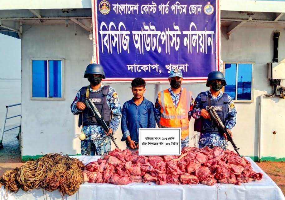 তিনি বলেন, গোপন সংবাদের ভিত্তিতে ২৫ অক্টোবর শনিবার ভোর ৪ টায় কোস্টগার্ড আউটপোস্ট নলিয়ান এর একটি আভিযানিক দল গোপন সংবাদের ভিত্তিতে সুন্দরবন সংলগ্ন খুলনার দাকোপ থানাধীন নলিয়ান এলাকায় একটি বিশেষ অভিযান পরিচালনা করে। অভিযান চলাকালীন ওই এলাকা হতে ১০৬ কেজি হরিণের মাংস ও ২০০ মিটার হরিণ শিকারের ফাঁদসহ ১ জন হরিণ শিকারিকে আটক করা হয়। জব্দকৃত হরিণের মাংস, ফাঁদ ও আটককৃত ব্যক্তির বিরুদ্ধে পরবর্তী আইনানুগ ব্যবস্থা গ্রহণের কার্যক্রম প্রক্রিয়াধীন রয়েছে।