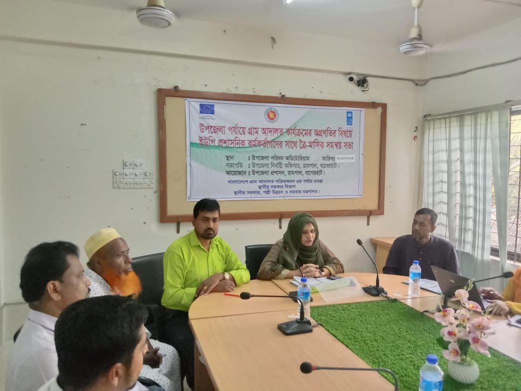 বাগেরহাট প্রতিনিধি:: বাগেরহাটের রামপাল উপজেলার গ্রাম আদালত বিষয়ক ইউপি প্রশাসনিক কর্মকর্তাদের সঙ্গে ত্রৈমাসিক সমন্বয় সভা মংগলবার সকালে উপজেলা পরিষদ অডিটোরিয়ামে উপজেলা নির্বাহী কর্মকর্তা তামান্না ফেরদৌসীর সভাপতিত্বে অনুষ্ঠিত হয়। উক্ত সভার প্রধান অতিথি হিসেবে উপস্থিত ছিলেন গ্রাম আদালত বিষয়ক প্রকল্পের ডি এম অ্যাডভোকেট মোঃ তৌফিকুল ইসলাম। এ সময় উপজেলার সকল ইউনিয়ন পরিষদের ইউপি প্রশাসনিক কর্মকর্তাগন এর সাথে গ্রাম আদালত কার্যক্রমের অগ্রগতি পর্যালোচনা ও করনীয় শীর্ষক বিষয়ে আদালতের রেজিস্টার ফরম ফরমেট বিতরণ করা হয়, একই সাথে ত্রৈমাসিক কার্যক্রম উপস্থাপনে গ্রাম আদালতের মামলা বাড়ানোর বিষয়ে পরামর্শ প্রদান করেন। উপজেলা নির্বাহী অফিসার অত্যন্ত গুরুত্বতার সাথে প্রত্যেকটা ইউপি প্রশাসনিক কর্মকর্তাদের গ্রাম আদালতের কার্যক্রমের বিষয়ে আলাপ-আলোচনা করেন। কোন কোন ইউনিয়ন পরিষদের কি সমস্যা কিভাবে সমাধান করা যায় সে বিষয়ে আলোচনা ও সমস্যার সমাধানের নির্দেশনা প্রদান করেন। মাসের সঠিক সময়ে মামলার রিপোর্ট করা। এবং প্রত্যেক মাসে সব কয়টি ইউনিয়ন পরিষদ থেকে কমপক্ষে পাঁচটি করে মামলা টার্গেট করে নিষ্পত্তি সহ সার্বিকভাবে জনগণের সাথে কাজ করার নির্দেশনা প্রদান করেন । তিনি আরো বলেন গ্রাম আদালতের উপরে মানুষের আস্থা বাড়াতে বিভিন্ন ভাবে প্রত্যেকটা ইউনিয়ন পরিষদের গ্রাম আদালতের উপরে প্রচার-প্রচারনার কার্যক্রম চালিয়ে যেতে হবে।