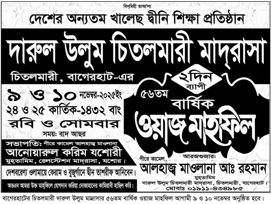 শুক্রবার (০৭ নভেম্বর) সন্ধ্যায় দারুল উলুম চিতলমারী মাদ্রাসার মুহ্তামিম আলহাজ্ব মাওলানা আঃ রহমান বলেন, ‘দেশের অন্যতম খালেছ দ্বীনি শিক্ষা প্রতিষ্ঠান দারুল উলুম চিতলমারী মাদ্রাসা। মাদ্রাসাটি শেরে বাংলা একে ফজলুল হকের ফুফু সামছুন্নেছা চৌধুরানীর ওয়াকফকৃত এস্টেটের উপর প্রতিষ্ঠিত। প্রতি বছর মাহফিলে তাঁদের ও পরিবারের জন্য দোয়া-খায়ের করা হয়। এখানে দেশের বিভিন্ন স্থান থেকে ধর্মপ্রাণ মুসলমানরা ওয়াজ শুনতে আসেন। মহিলাদের পর্দাসহ ওয়াজ শোনার ব্যবস্থা আছে। আমাদের ছাত্র ও স্থানীয়রা স্বেচ্ছাসেবক হিসেবে সর্বদা নিয়োজিত থাকে।’