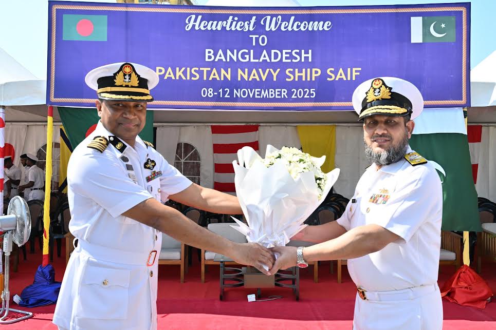 নিজস্ব প্রতিবেদক:: চার দিনের শুভেচ্ছা সফরে বাংলাদেশে এসে পৌঁছেছে পাকিস্তান নৌবাহিনী জাহাজ পিএনএস সাইফ। শনিবার (৮ নভেম্বর ) চট্টগ্রাম বন্দরে এসে পৌঁছালে কমান্ডার চট্টগ্রাম নৌ অঞ্চলের পক্ষ থেকে চিফ স্টাফ অফিসার জাহাজের কর্মকর্তা ও নাবিকদের স্বাগত জানান। এ সময় নৌবাহিনীর সুসজ্জিত বাদকদল ঐতিহ্যবাহী রীতি অনুযায়ী ব্যান্ড পরিবেশন করে। জাহাজটিকে স্বাগত জানাতে অন্যান্যদের মধ্যে বাংলাদেশে নিযুক্ত পাকিস্তান হাইকমিশনের প্রতিনিধিসহ নৌবাহিনীর স্থানীয় উচ্চপদস্থ কর্মকর্তাগণ উপস্থিত ছিলেন। এর আগে জাহাজটি বাংলাদেশের জলসীমায় এসে পৌঁছালে বাংলাদেশ নৌবাহিনী জাহাজ বানৌজা স্বাধীনতা তাদের অভ্যর্থনা জানায়।