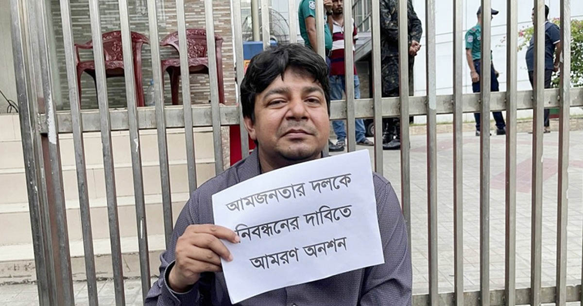 নিজস্ব প্রতিবেদক:: নির্বাচন কমিশনের (ইসি) দল নিবন্ধনের তালিকায় ‘আমজনতার দল’ না থাকায় ইসির প্রধান ফটকের সামনে গত মঙ্গলবার থেকে আমরণ অনশনরত দলটির সদস্যসচিব মো. তারেক রহমান গুরুতর অসুস্থ হয়ে পড়ায় তাকে হাসপাতালে নেওয়া হয়েছে।
