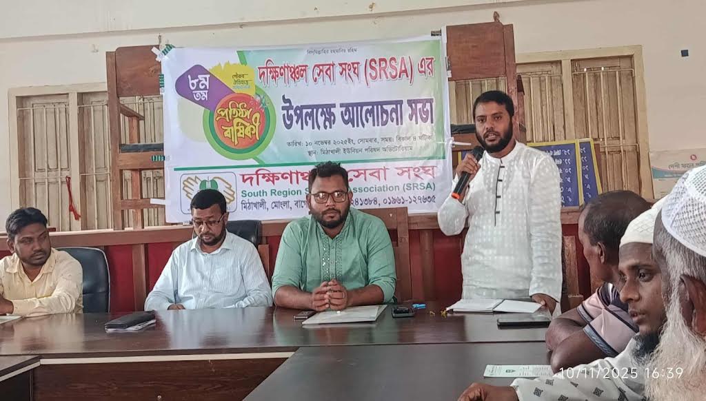 মোংলা (বাগেরহাট) প্রতিনিধি:: দক্ষিণাঞ্চল সেবা সংঘ(SRSA) এর ৮ম প্রতিষ্ঠা বার্ষিকী উপলক্ষে আলোচনা সভা অনুষ্ঠিত হয়েছে মিঠাখালী ইউনিয়ন পরিষদ অডিটোরিয়ামে ১০ নভেম্বর সোমবার বিকাল ৪ ঘটিকায়। SRSA'র উপদেষ্টা, সদস্য ও শুভাকাঙ্ক্ষীদের উপস্থিতে অনুষ্ঠানে সঞ্চালনা করেন SRSA'র সাধারণ সম্পাদক এম এ আমিন এবং সভাপতিত্ব করেন এস এম আব্দুল্লাহ আল মামুন।