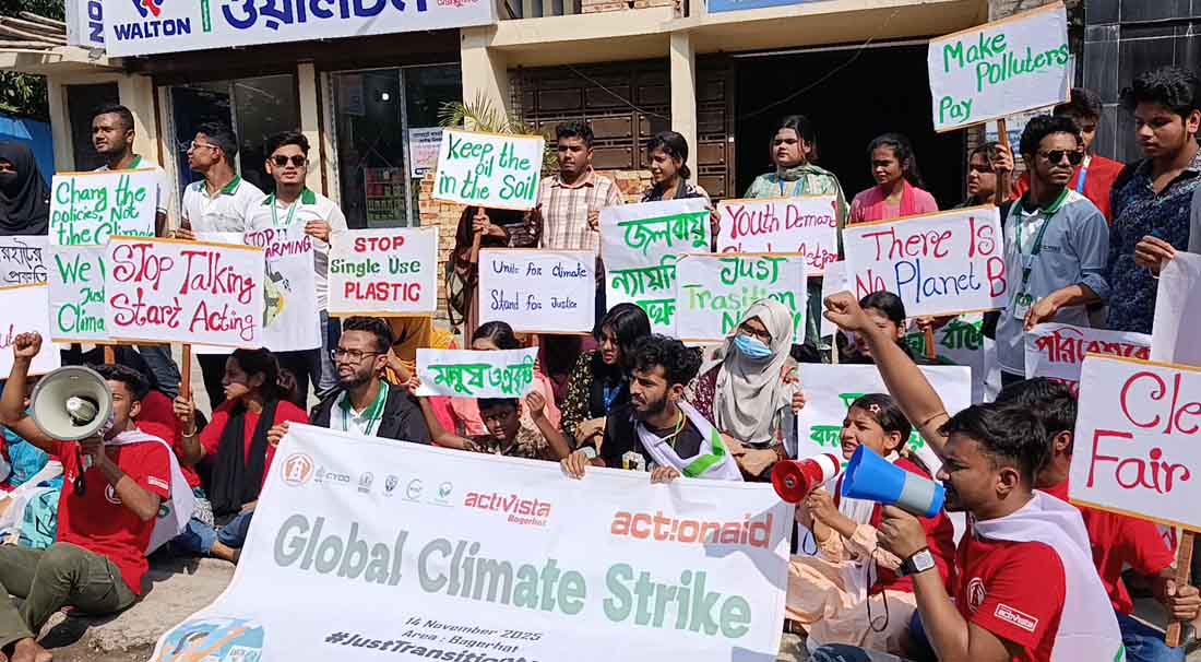 নকীব মিজানুর রহমান,বাগেরহাট থেকে : “ন্যায়সঙ্গত ও ন্যায্য রূপান্তরের জন্য তরুণদের তাৎক্ষণিক পদক্ষেপের আহ্বান” এই প্রতিপাদ্য নিয়ে বাগেরহাটে অনুষ্ঠিত হয়েছে গ্লোবাল ক্লাইমেট স্ট্রাইক ২০২৫। এক্টিভিস্টা বাগেরহাট, একশনএইড বাংলাদেশ ও বাঁধন মানব উন্নয়ন সংস্থার যৌথ আয়োজনে এবং গ্লোবাল প্লাটফর্ম বাংলাদেশের সহযোগিতায় শুক্রবার সকালে শহরের দশানী ট্রাফিক মোড়ে এ স্ট্রাইক অনুষ্ঠিত হয়। এতে শতাধিক তরুণ জলবায়ু কর্মী, স্থানীয় সামাজিক সংগঠনের প্রতিনিধি, শিক্ষার্থী ও সাংবাদিকরা অংশ নেন।