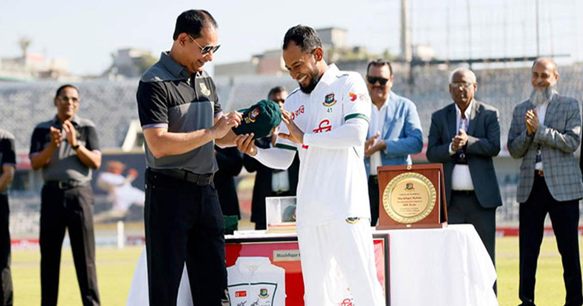 তার আগে সকালে ম্যাচ শুরুর আগেই মুশফিককে সম্মান জানাতে আয়োজন হয় সংক্ষিপ্ত হলেও আবেগঘন এক অনুষ্ঠান। প্রথম টেস্টের অধিনায়ক হাবিবুল বাশার তার হাতে বিশেষ ক্যাপ পরিয়ে দেন। পরে বিসিবি সভাপতি ও দেশের প্রথম টেস্ট সেঞ্চুরিয়ান আমিনুল ইসলাম বুলবুল তুলে দেন স্মারক ক্রেস্ট। মুশফিকের পরিবার, অভিষেক টেস্টের সতীর্থেরা—সবাই মিলে মুহূর্তটিকে স্মরণীয় করে তুলেন।