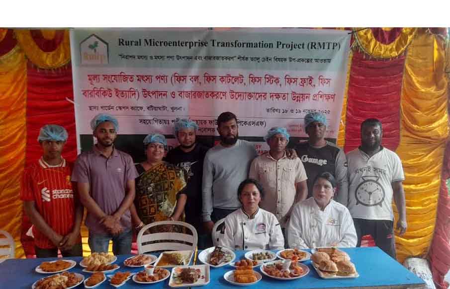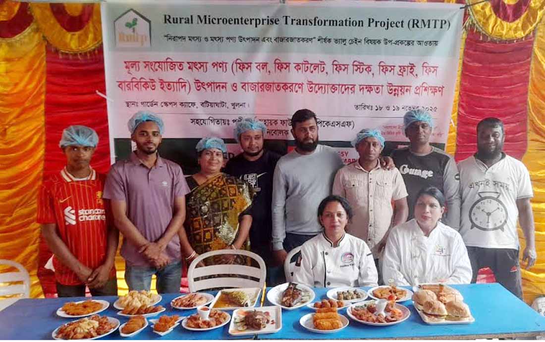 প্রশিক্ষক হিসাবে উপস্থিত ছিলেন প্রিন্সিপাল প্রিজম হোটেল ম্যানেজমেন্ট এন্ড স্কিল ডেভেলপমেন্ট ইনস্টিটিউট-যশোর মুসলিমা খাতুন এবং সহযোগী প্রশিক্ষক হিসাবে ছিলেন সেলিনা আক্তার শিলা। প্রশিক্ষণে উদ্যোক্তাগণ মাছ দ্বারা তৈরী বিভিন্ন পদ যেমন- ফিস বল, ফিস কাটলেট, ফিস ষ্টিক, ফিস ফ্রাই, ফিস বারবিকিউ (BBQ),ফিস ফিংগার, প্রন/শ্রিম্প ফ্রাই, ফিস চপ, ফিস বার্গার, ফিস ললিপপ, ফিস সসেচ বল, ফিস গ্রিল, ফিস নাগেট ইত্যাদি প্রায় বিশ রকমের খাবার তৈরির পদ্ধতি হাতে- কলমে শিক্ষা লাভ করেন। প্রশিক্ষণটি ছিলো ব্যবহারিক (প্র্যাকটিক্যাল) সেশন যা প্রশিক্ষণার্থী ও প্রশিক্ষক উভয়ের মধ্যে জ্ঞানের আদান-প্রদান ঘটতে দেখা যায় যা অত্যন্ত স্বতঃস্ফূর্ত অংশগ্রহণের মাধ্যমে সম্পন্ন হয়।