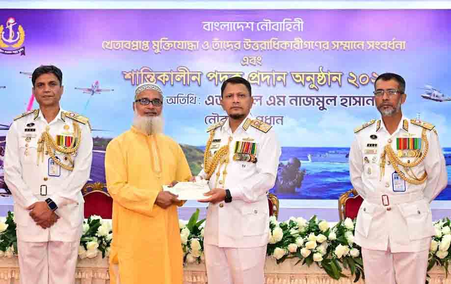 নিজস্ব প্রতিবেদক:: সশস্ত্র বাহিনী দিবস-২০২৫ উদযাপন উপলক্ষ্যে নৌবাহিনীর খেতাবপ্রাপ্ত বীর মুক্তিযোদ্ধা ও তাঁদের উত্তরাধিকারীগণকে সংবর্ধনা এবং বিভিন্ন ক্ষেত্রে বীরত্ব ও সাহসিকতাপূর্ণ কাজের স্বীকৃতিস্বরূপ নৌ সদস্যদের শান্তিকালীন পদক প্রদান করা হয়। এ উপলক্ষ্যে আজ শুক্রবার (২১ নভেম্বর ) নৌবাহিনী সদর দপ্তরে সাগরিকা হলে আয়োজিত অনুষ্ঠানে নৌবাহিনী প্রধান এডমিরাল এম নাজমুল হাসান সম্মাননা স্মারক ও শান্তিকালীন পদক তুলে দেন। উক্ত অনুষ্ঠানে নৌবাহিনীর উর্ধ্বতন কর্মকর্তা, খেতাবপ্রাপ্ত বীর মুক্তিযোদ্ধা ও তাদের পরিবারের সদস্য এবং শান্তিকালীন পদক বিজয়ীগণসহ অন্যান্য কর্মকর্তাগণ উপস্থিত ছিলেন।