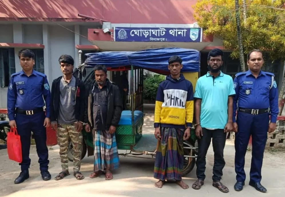 রফিকুল ইসলাম (৩৮)। সকলেই গাইবান্ধা জেলার গোবিন্দগঞ্জ থানার বিভিন্ন এলাকার বাসিন্দা। ঘোড়াঘাট থানার ওসি (তদন্ত) শহিদুল ইসলাম বলেন, “গ্রেফতারকৃতদের কাছ থেকে ছিনতাই হওয়া অটো মিশুকটি উদ্ধার করা হয়েছে। তাদের বিরুদ্ধে আইনগত ব্যবস্থা গ্রহণ শেষে বিজ্ঞ আদালতে প্রেরণ করা হয়েছে।