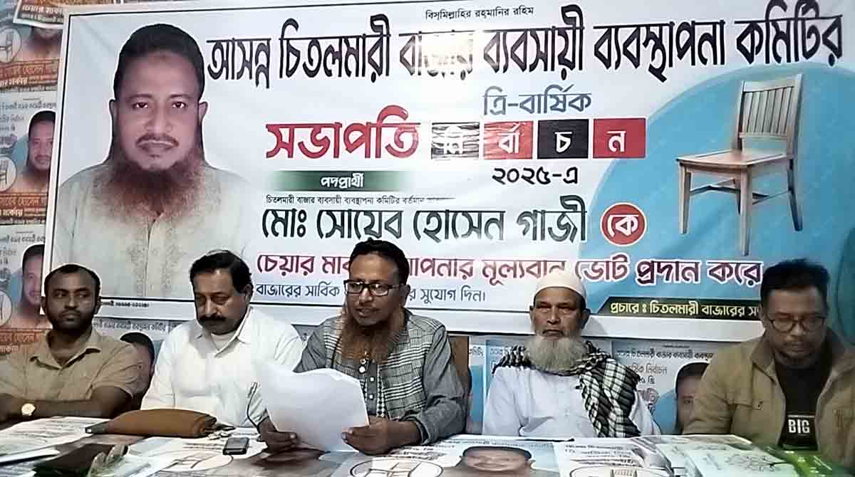 চিতলমারী প্রতিনিধি:: বাগেরহাটের ঐতিহ্যবাহী চিতলমারী উপজেলা সদর বাজার ব্যবসায়ী ব্যবস্থাপনা কমিটির নির্বাচন আগামী ২৮ নভেম্বর অনুষ্ঠিত হতে যাচ্ছে। এ লক্ষে মঙ্গলবার (২৫ নভেম্বর) বিকেল ৫ টায় সভাপতি প্রার্থী চেয়ার প্রতীকের মোঃ সোয়েব হোসেন গাজী আনুষ্ঠানিকভাবে তাঁর নির্বাচনী ১৪ দফা ইশতেহার ঘোষণা করেন।