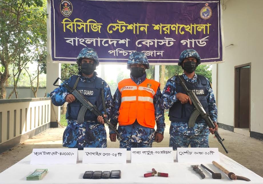 গোপন সংবাদের ভিত্তিতে ২৬ নভেম্বর মধ্যরাত ১টায় কোস্ট গার্ড স্টেশন শরণখোলা ও পুলিশের সমন্বয়ে বাগেরহাটের শরণখোলা থানাধীন রায়েন্দা বাজার সংলগ্ন এলাকায় একটি যৌথ অভিযান পরিচালনা করা হয়। অভিযান চলাকালীন উক্ত এলাকা হতে পরিত্যক্ত অবস্থায় ৩টি দেশীয় অস্ত্র, ৩ রাউন্ড তাজা কার্তুজ, ৪৩ হাজার জাল টাকা এবং ৪টি বাটন মোবাইল ফোন জব্দ করা হয়। এ সময় যৌথ বাহিনীর উপস্থিতি টের পেয়ে দুষ্কৃতিকারী পালিয়ে যাওয়ায় কাউকে আটক করা সম্ভব হয়নি। জব্দকৃত আলামতের পরবর্তী আইনানুগ ব্যবস্থা গ্রহণের কার্যক্রম প্রক্রিয়াধীন রয়েছে।