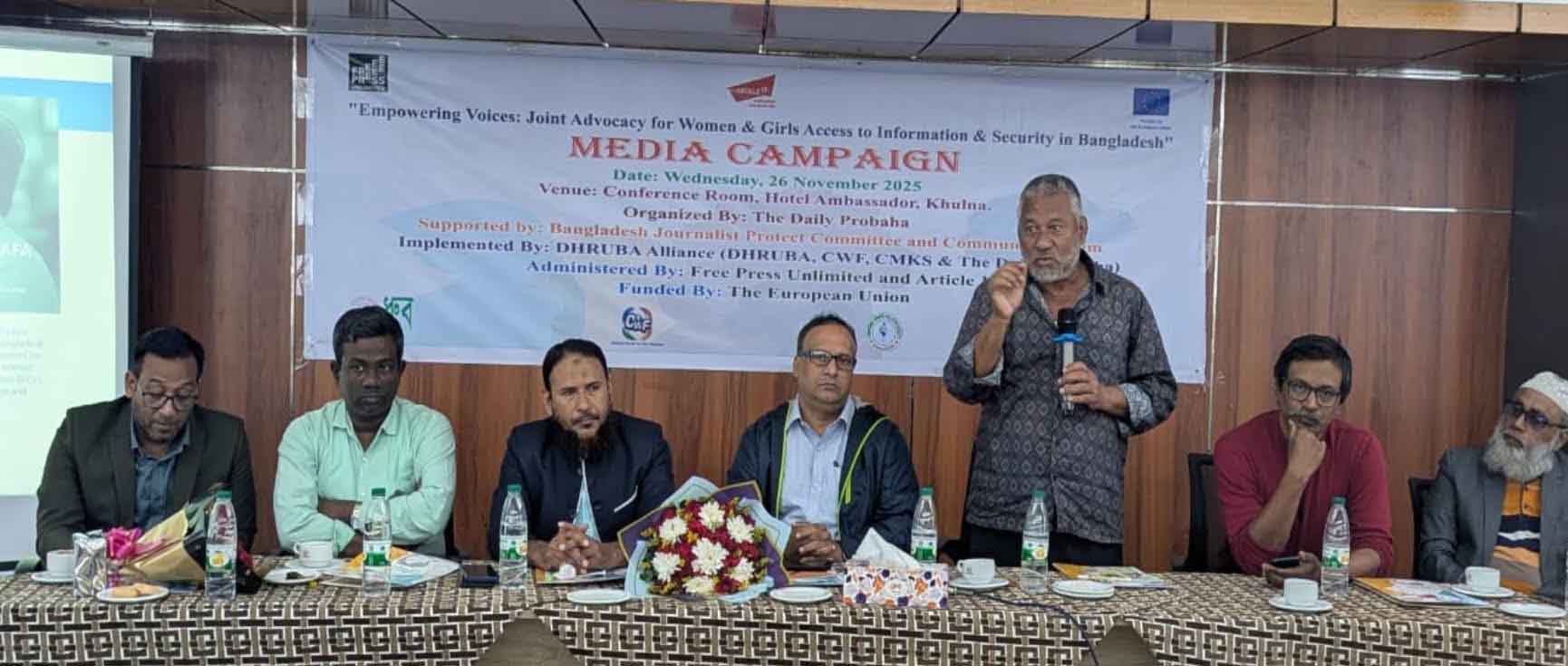 মোঃ জাহিদুল ইসলাম :: খুলনায় ডিজিটাল প্ল্যাটফর্মে কর্মরত সাংবাদিকদের জন্য একদিনের মিডিয়া ক্যাম্পেইন অনুষ্ঠিত হয়েছে। বাংলাদেশ জার্নালিস্ট প্রটেক্ট কমিটি (বিজেপিসি) এর আয়োজনে এবং ফ্রি প্রেস আনলিমিটেড, আর্টিকেল ১৯ ও ইউরোপীয় ইউনিয়নের সহযোগিতায় কর্মশালাটি হোটেল এম্বাসিডারে সকাল ১০টা থেকে দুপুর ২টা পর্যন্ত অনুষ্ঠিত হয়।
