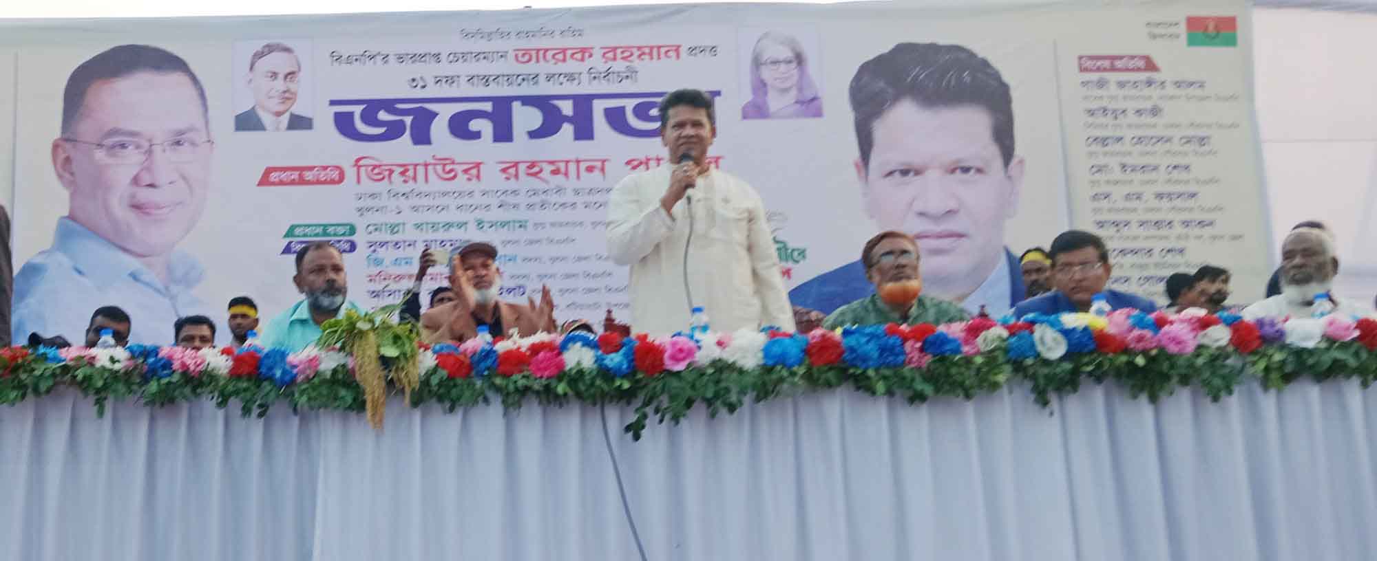 বুধবার বিকাল ৩ টায় দাকোপ উপজেলা সদর চালনা এম এম কলেজ মাঠে অনুষ্ঠিত জনসভায় প্রধান অতিথির বক্তৃতায় খুলনা-১ আসনে বিএনপির মনোনয়ন প্রত্যাশী ঢাকা বিশ্ববিদ্যালয়ের সাবেক ছাত্রনেতা জিয়াউর রহমান পাপুল বলেন, ক্ষুধা দারিদ্রমুক্ত সমৃদ্ধির বাংলাদেশ বিনির্মানে দেশ নায়েক তারেক রহমান ঘোষিত ৩১ দফা কর্মসূচী বাস্তবায়নের বিকল্প নেই। তিনি বলেন অবহেলিত দাকোপ বটিয়াঘাটার উন্নয়ন এবং সকল সম্প্রদায়ের মানুষের নিরাপত্তা নিশ্চিত করা আমার লক্ষ্য। চাঁদাবাজ দখলদারদের সাথে আমার কোন সম্পর্ক নেই। শান্তি এবং নিরাপত্তা নিশ্চিত করতে চিহ্নিত ওই সকল অপরাধীদের বিরুদ্ধে আমি কঠোর ব্যবস্থা গ্রহন করবো ইনশাল্লাহ। খুলনা জেলা বিএনপির অন্যতম সদস্য শাকিল আহমেদ দিলুর সভাপতিত্বে এবং চালনা পৌরসভা বিএনপির সাবেক সদস্য সচীব আল আমিন সানার পরিচালনা অনুষ্ঠিত বিশাল এই জনসভায় প্রধান বক্তা হিসাবে বক্তৃতা করেন খুলনা জেলা বিএনপির যুগ্ম আহবায়ক মোল্লা খায়রুল ইসলাম। বিশেষ অতিথির বক্তৃতা করেন জেলা বিএনপির সদস্য সুলতান মাহমুদ, জিএম রফিকুল ইসলাম, মনিরুজ্জামান লেলিন, আসাবুর রহমান পাইলট, বটিয়াঘাটা উপজেলা বিএনপির আহবায়ক এজাজুর রহমান শামীম। বক্তৃতা করেন দাকোপ উপজেলা বিএনপির সাবেক যুগ্ম আহবায়ক গাজী জাহাঙ্গীর আলম, আয়ুব আলী কাজী আব্দুস সাত্তার আকন, জসিম উদ্দিন, আসাবুর রহমান হাওলাদার, মানস গোলদার, যুবনেতা অমল গোলদার, আনোয়ার হোসেন আনো, ছাত্রনেতা মাসুম বিল্লাহ, রেহানা ইসলাম, কৈশল্যা রায়, মঞ্জিলা পারভীন, কানিজ ফাতেমা প্রমুখ।