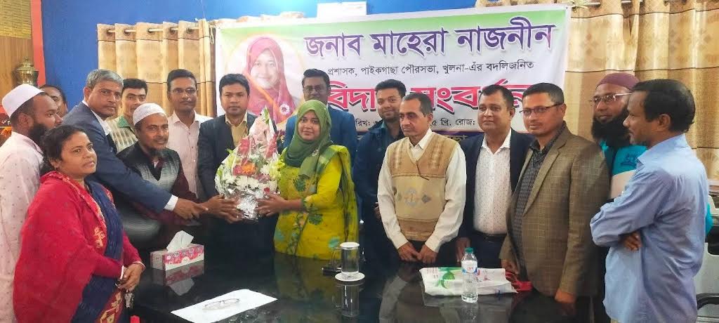 পাইকগাছা (খুলনা) প্রতিনিধি:: পাইকগাছা পৌরসভার প্রশাসক ও উপজেলা নির্বাহী অফিসার (ইউএনও) মাহেরা নাজনীনকে বিদায়ী শুভেচ্ছা জানিয়েছে পৌরসভার কর্মকর্তা-কর্মচারী বৃন্দ। দায়িত্ব পালনকালে তাঁর নিষ্ঠা, কর্মদক্ষতা ও মানবিক নেতৃত্বে পৌরসভার সার্বিক উন্নয়ন কার্যক্রম এগিয়ে যায় বলে বিদায়ী অনুষ্ঠানে বক্তারা উল্লেখ করেন।