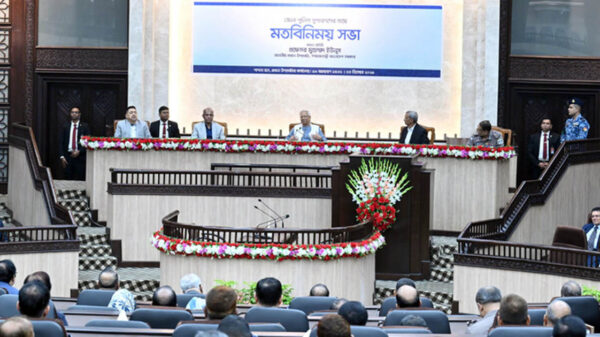 সভার শুরুতে মুক্তিযুদ্ধে আত্মদানকারী শহিদ ও যুদ্ধাহত মুক্তিযোদ্ধা, বীর মুক্তিযোদ্ধা ও নির্যাতিত মা-বোনসহ জুলাই’২৪ এ আত্মদানকারী শহিদদের সশ্রদ্ধ চিত্তে স্মরণ করা হয়।