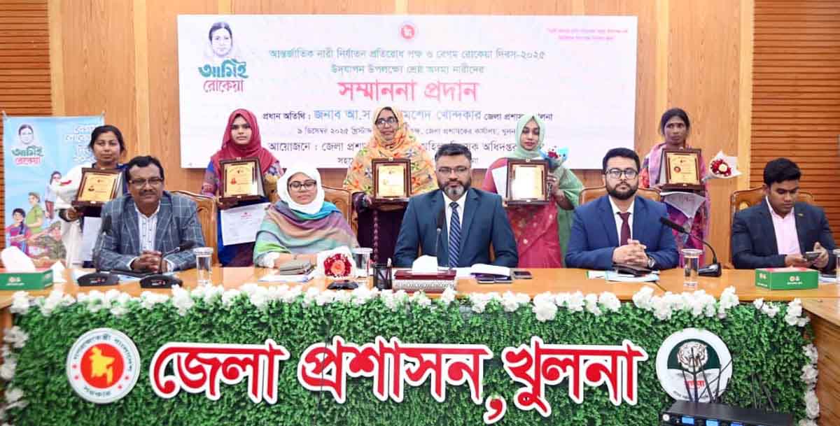 নিজস্ব প্রতিনিধি:: আন্তর্জাতিক নারী নির্যাতন প্রতিরোধ পক্ষ এবং বেগম রোকেয়া দিবস উপলক্ষ্যে আলোচনা সভা ও পাঁচ শ্রেষ্ঠ অদম্য নারী সম্মাননা প্রদান অনুষ্ঠান মঙ্গলবার বিকালে খুলনা জেলা প্রশাসকের সম্মেলনকক্ষে অনুষ্ঠিত হয়। অনুষ্ঠানে প্রধান অতিথি ছিলেন জেলা প্রশাসক আ. স. ম. জামশেদ খোন্দকার। জেলা প্রশাসন ও মহিলা বিষয়ক অধিদপ্তর এ অনুষ্ঠানের আয়োজন করে।
