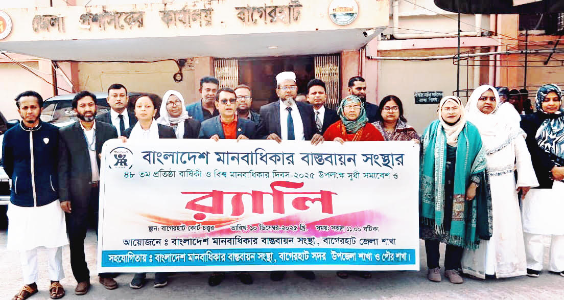 বাগেরহাট প্রতিনিধি :: বাগেরহাটে বাংলাদেশ মানবাধিকার বাস্তবায়ন সংস্থার উদ্যোগে সংগঠনের ৪৮ তম প্রতিষ্ঠা বার্ষিকী ও ৭৭ তম বিশ্ব মানবাধিকার দিবস ২০২৫ পালিত হয়েছে।বাংলাদেশ মানবাধিকার বাস্তবায়ন সংস্থার বাগেরহাট জেলা শাখার উদ্যোগে, সদর উপজেলা শাখা ও পৌর শাখার সহযোগিতায় বুধবার (১০ ডিসেম্বর ) সকালে বাগেরহাট কোর্ট চত্বর এলাকায রেলি ও সুধী সমাবেশ অনুষ্ঠিত হয়। সমাবেশে সভাপতিত্ব করেন বাগেরহাট জেলা মানবাধিকার বাস্তবায়ন সংস্থার সাধারণ সম্পাদক সৈয়দ শওকত হোসেন। উক্ত অনুষ্ঠানে অন্যদের মধ্যে উপস্থিত ছিলেন মানবাধিকার বাস্তবায়ন সংস্থার পৌর শাখার সিনিয়র সহ-সভাপতি এজিপি এ্যাডভোকেট হিরক মিনা, সহ-সভাপতি খুরশিদা রহমান জুই, সদর উপজেলা শাখার সিনিয়র যুগ্ম সাধারণ সম্পাদক এ্যাডভোকেট জান্নাতুল ফেরদাউস তানিয়া, এ্য।ডভোকেট আব্দুস সালাম, জেলা শাখার কোষাধক্ষ সৈয়দা তৈফুন নাহার, জেলা কমিটির সদস্য আলামিন খান সুমন, কাজী সাইদুর রহমান সবুজ, মিনারা হোসেন রেখা, এ্যাডভোকেট ফাহমিদা খানম,উপজেলা শাখার সদস্য এ্য।ডভোকেট তানিয়া খাতুন, পৌর শাখার দপ্তর সম্পাদক ওমর আলী, আবিদা সুলতানা সহ বাংলাদেশ মানবাধিকার বাস্তবায়ন সংস্থার বাগেরহাট জেলার বিভিন্ন উপজেলা ও পৌর শাখার সদস্য বৃন্দ এ সময় উপস্থিত ছিলেন#