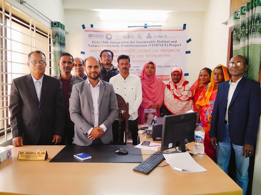 ফিশনেট প্রল্পের আওতায় বেসরকারী উন্নয়ন সংস্থা ‘উত্তরন’ এর সহযোগীতায় ওসান গ্রান্টস প্রোগ্রাম এবং ইউকে ইন্টারন্যাশনাল ডেভেলপমেন্টের আর্থিক সহেযোগীতায় ১০ ডিসেম্বর বুধবার সকাল ১০ টায় মোংলা উপজেলায় মৎস্য সম্পদ উন্নয়নে মৎস্যজীবী নেটওয়ার্ক এবং ফেডারেশনের উদ্যেগে সিনিয়র উপজেলা মৎস্য অফিসারের কার্যালয়ে বিষয়ভিত্তিক আলোচনা সভা অনুষ্ঠিত হয়। আলোচনার বিষয় ছিল। জেলে নিবন্ধন, মৎস্যজীবী সমবায় সমিতি গঠন ও ক্যাম্পেইন কাযক্রম।