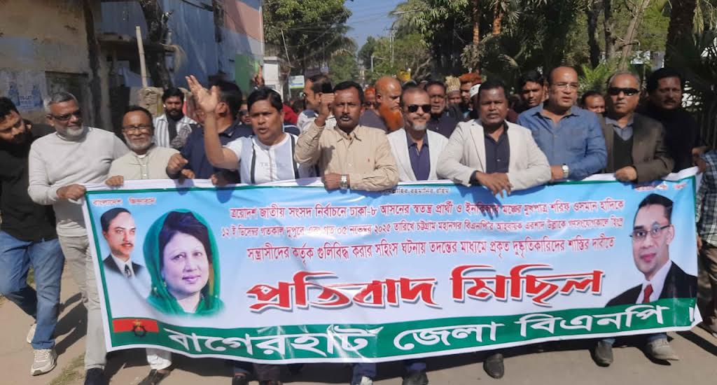 বাগেরহাট প্রতিনিধি:: ত্রয়োদশ জাতীয় সংসদ নির্বাচনে ঢাকা-৮ আসনের স্বতন্ত্র প্রার্থী ও ইনকিলাব মঞ্চের মুখপাত্র শরিফ ওসমান হাদি ও চট্টগ্রাম-৮ আসনে বিএনপি'র মনোনয়নপ্রাপ্ত ও চট্টগ্রাম মহানগর বিএনপি'র আহবায়ক এরশাদ উল্লাকে গণসংযোগকালে সন্ত্রাসীদের গুলিতে আহাতের ঘটনায় দোষীদের দৃষ্টান্তমূলক শাস্তির দাবিতে প্রতিবাদ সমাবেশ ও বিক্ষোভ মিছিল করেছে বাগেরহাট জেলা বিএনপি।