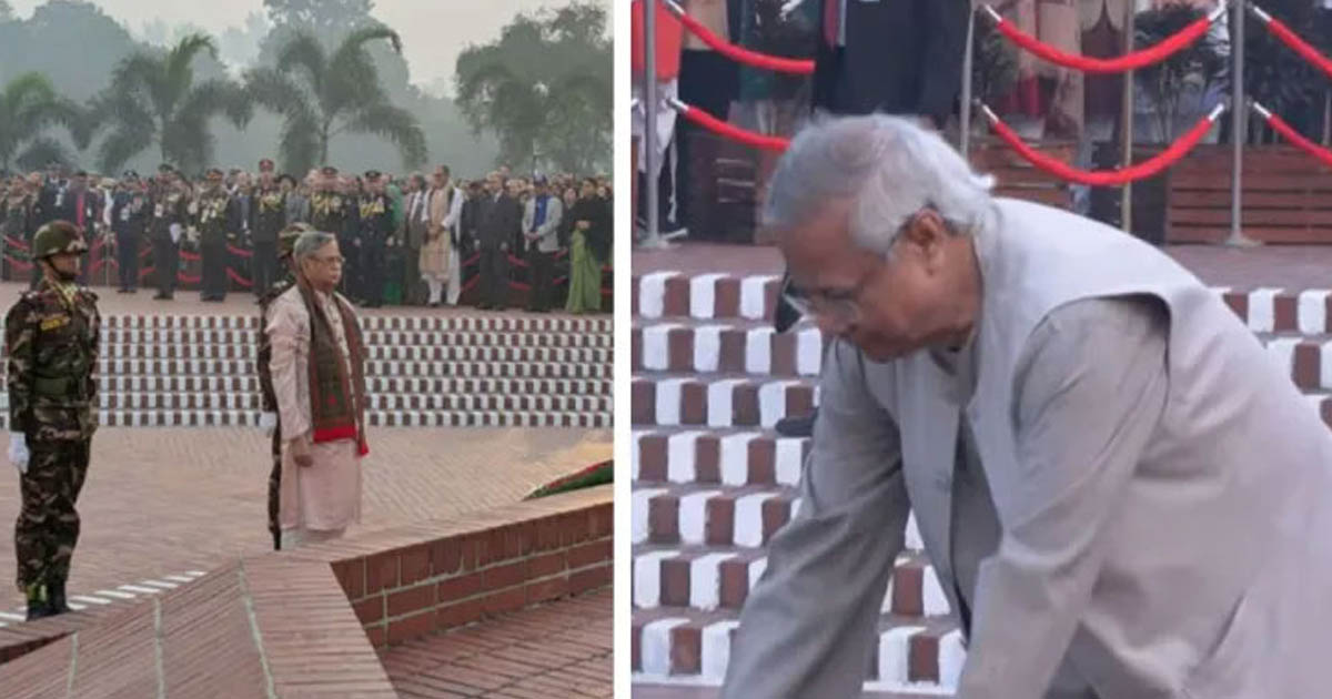 সকাল ৬টা ৩০ মিনিটে রাষ্ট্রপতি মো. সাহাবুদ্দিন প্রথমে স্মৃতিসৌধে প্রবেশ করে মূল বেদিতে ফুল দিয়ে শ্রদ্ধা নিবেদন করেন। এরপর সকাল ৭টা ১০ মিনিটের দিকে শহীদ বেদিতে শ্রদ্ধা জানান প্রধান উপদেষ্টা ড. মুহাম্মদ ইউনূস। ১৯৭১ সালের মহান মুক্তিযুদ্ধের বীর শহীদদের স্মৃতির প্রতি বিনম্র শ্রদ্ধা জানাতে সেখানে কিছুক্ষণ নীরবে দাঁড়িয়ে থাকেন তাঁরা।