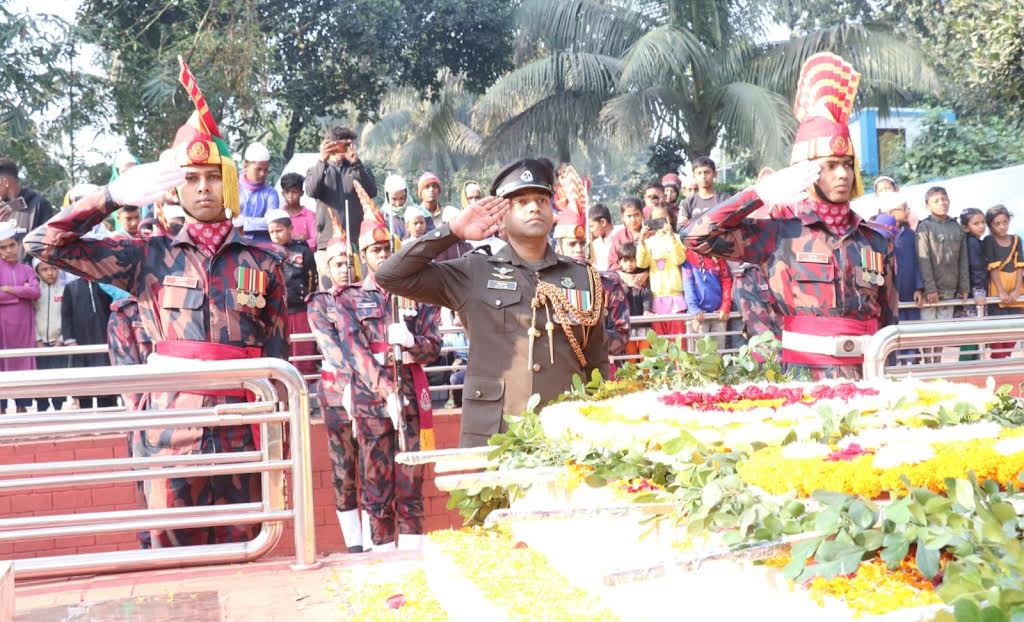 আজ মঙ্গলবার (১৬ ডিসেম্বর) সকাল সাড়ে ৯টার দিকে মহান বিজয় দিবস উপলক্ষে বিজিবি’র কাশিপুর বিওপির সন্নিকটে বীরশ্রেষ্ঠ শহীদ ল্যান্স নায়েক নূর মোহাম্মদ শেখ এর সমাধিস্থলে মহাপরিচালক মহোদয়ের পক্ষ থেকে যশোর ব্যাটালিয়ন (৪৯ বিজিবি) এর ব্যবস্থাপনায় গার্ড অব অনার প্রদান, পুষ্পস্তবক অর্পন, বীরশ্রেষ্ঠ শহীদ ল্যান্স নায়েক নূর মোহাম্মদ শেখ এর রুহের মাগফেরাত কামনা করে ফাতেহা পাঠ ও বিশেষ মোনাজাত এবং সকলের মাঝে তবারক বিতরণ করা হয়। এ সময় যশোর ব্যাটালিয়ন (৪৯ বিজিবি) এর উপ অধিনায়ক মেজর নূর উদ্দিন আহমাদ ও বীরশ্রেষ্ঠের পরিবারবর্গ, স্থানীয় জনপ্রতিনিধি ও গন্যমান্য ব্যক্তিবর্গ উপস্থিত ছিলেন।