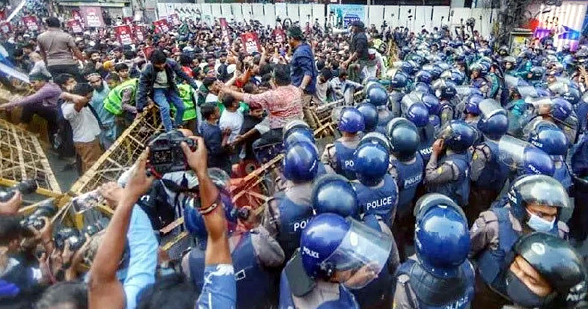 ডেস্ক:: রাজধানীতে জুলাই ঐক্যের ঘোষিত ‘মার্চ টু ইন্ডিয়ান হাইকমিশন’ কর্মসূচিতে পুলিশি বাধার ঘটনা ঘটেছে। মিছিলটি আটকে দেওয়ায় রাজধানীর ব্যস্ততম প্রগতি সরণিতে সাময়িকভাবে যান চলাচল বন্ধ হয়ে যায়।