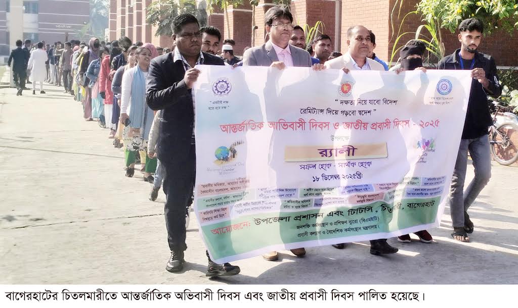 চিতলমারী প্রতিনিধি:: ‘দক্ষতা নিয়ে যাবো বিদেশ র্যামিট্যান্স দিয়ে গড়বো স্বদেশ’ এই শ্লোগানকে সামনে রেখে বাগেরহাটের চিতলমারীতে আন্তর্জার্তিক অভিবাসী দিবস এবং জাতীয় প্রবাসী দিবস পালিত হয়েছে। বৃহস্পতিবার (১৮ ডিসেম্বর) সকাল ১০ টায় চিতলমারী কারিগরি প্রশিক্ষণ কেন্দ্রে (টিটিসি) বর্ণাঢ্য র্যালী ও আলোচনা সভা হয়। সভায় প্রধান অতিথি হিসেবে উপস্থিত ছিলেন উপজেলা নির্বাহী কর্মকর্তা (ইউএনও) মোঃ সাজ্জাদ হোসেন।
