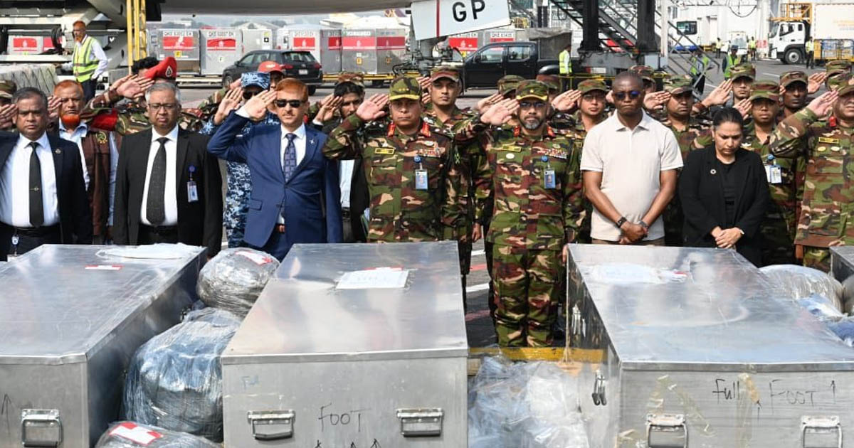শনিবার বেলা ১১টা ৫ মিনিটে এমিরেটস এয়ারলাইন্সের একটি বিশেষ ফ্লাইটে মরদেহগুলো হযরত শাহজালাল আন্তর্জাতিক বিমানবন্দরে এসে পৌঁছায়। আন্তঃবাহিনী জনসংযোগ পরিদপ্তরের (আইএসপিআর) এক সংবাদ বিজ্ঞপ্তিতে এ তথ্য নিশ্চিত করা হয়েছে।