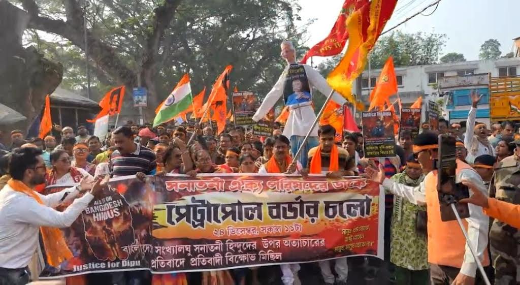 বেনাপোল প্রতিনিধি:: বেনাপোলের ওপারে ভারতের পেট্রাপোল বন্দর এলাকায় বাংলাদেশ বিরোধী বিক্ষোভ সমাবেশ করেছে সনাতনী ঐক্য পরিষদ। বাংলাদেশের ময়মনসিংহের ভালুকা উপজেলায় পোশাক কারখানার শ্রমিক দিপু চন্দ্র দাসকে হত্যার প্রতিবাদে আজ বুধবার (২৪ ডিসেম্বর) দুপুরে তারা এই সমাবেশের ডাক দেয়।