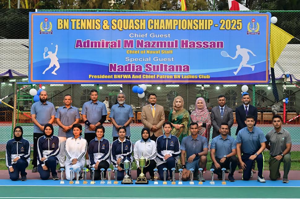 নিজস্ব প্রতিবেদক:: বাংলাদেশ নৌবাহিনীর বাৎসরিক ‘টেনিস ও স্কোয়াশ প্রতিযোগিতা-২০২৫’ এর সমাপনী অনুষ্ঠান আজ বুধবার (২৪ ডিসেম্বর ) চট্টগ্রামের ‘এরিয়া টেনিস এন্ড স্কোয়াশ কমপ্লেক্স’-এ অনুষ্ঠিত হয়েছে। প্রতিযোগিতার সমাপনী দিনে মাননীয় নৌবাহিনী প্রধান এডমিরাল এম নাজমুল হাসান প্রধান অতিথি এবং বাংলাদেশ নৌবাহিনী পরিবার কল্যাণ সংঘের প্রেসিডেন্ট নাদিয়া সুলতানা বিশেষ অতিথি হিসেবে উপস্থিত থেকে খেলা উপভোগ করেন এবং বিজয়ীদের হাতে পুরস্কার তুলে দেন।