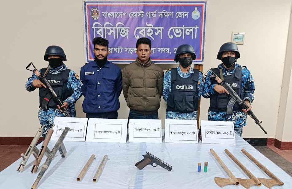 তিনি বলেন, গোপন সংবাদের ভিত্তিতে ২৮ ডিসেম্বর ২০২৫ তারিখ রবিবার ভোর ৪টায় কোস্ট গার্ড বেইস ভোলা ও পুলিশের সমন্বয়ে ভোলার সদর থানাধীন শরীফ বাজার সংলগ্ন এলাকায় একটি যৌথ অভিযান পরিচালনা করা হয়। অভিযান চলাকালীন উক্ত এলাকা হতে ১টি বিদেশী পিস্তল, ৩টি দেশীয় আগ্নেয়াস্ত্র, ২টি দেশীয় আগ্নেয়াস্ত্রের ব্যারেল, ৩টি দেশীয় অস্ত্র এবং ২ রাউন্ড কার্তুজসহ মোঃ রাসেল (৩৭) কে আটক করা হয়।