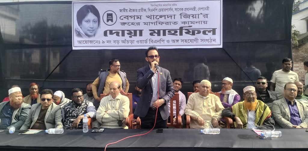 বেনাপোল প্রতিনিধি:: সাবেক প্রধানমন্ত্রী ও বিএনপি চেয়ারপারসন বেগম খালেদা জিয়ার রুহের মাগফিরাত কামনায় যশোরের শার্শা উপজেলার বেনাপোল পোর্ট থানার বড় আঁচড়ার ৯ নম্বর ওয়ার্ডে দোয়া মাহফিল অনুষ্ঠিত হয়েছে।