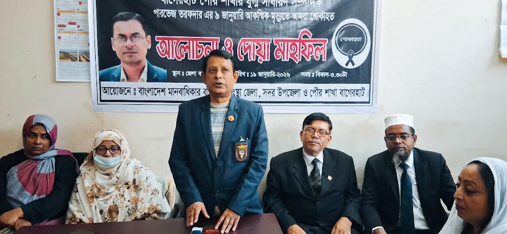 বাগেরহাট প্রতিনিধি :: বাগেরহাটে বাংলাদেশ মানবাধিকার বাস্তবায়ন সংস্থার উদ্যোগে সংগঠনের পৌর শাখার যুগ্ম সাধারণ সম্পাদক প্রয়াত পারভেজ তরফদার এর স্মরণে আলোচনা ও দোয়া মাহফিল অনুষ্ঠিত হয়েছে। সোমবার (১৯জানুয়ারি ) বিকেলে জেলা শাখার উদ্যোগে কোর্ট চত্ত্বর এলাকায় জেলা কার্যালয়ে অনুষ্ঠিত আলোচনা ও দোয়া মাহফিলে সভাপতিত্ব করেন সংগঠনের বাগেরহাট জেলা শাখার সভাপতি অ্যাডভোকেট মোসাম্মৎ মেহেরুন নেছ। জেলা শাখার সাধারণ সম্পাদক সৈয়দ শওকত হোসেনের সঞ্চালনায় অনুষ্ঠিত আলোচনা ও দোয়া মাহফিলে অন্যান্যদের মধ্যে উপস্থিত ছিলেন সংগঠনের বাগেরহাট সদর উপজেলা শাখার সভাপতি অ্যাডভোকেট মাহবুব মোর্শেদ লালন,(পি ,পি), বাগেরহাট পৌর শাখার ভারপ্রাপ্ত সভাপতি অ্যাডভোকেট হিরক মিনা(এ, জি, পি), বাংলাদেশ মানবাধিকার বাস্তবায়ন সংস্থার বাগেরহাট জেলা শাখার সদস্য আ্যডভোকেট আফরোজা খাতুন, সদর উপজেলা শাখার যুগ্ম সাধারণ সম্পাদক অ্যাডভোকেট জান্নাতুল ফেরদাউস তানিয়া, সদস্য আ্যডভোকেট তানিয়া আক্তার, বাগেরহাট পৌর শাখার সহ-সভাপতি আ্যডভোকেট ফাহমিদা সুলতানা,দপ্তর সম্পাদক মোঃ ওমর আলী, সাংবাদিক নকিব মিজানুর রহমান, আ্যডভোকেট আইরিন সুলতানা, আ্যডভোকেট শারমিন আক্তার প্রমূখ। আলোচনা সভা শেষে পৌর শাখার যুগ্ম সাধারণ সম্পাদক প্রয়াত পারভেজ তরফদারের স্মরণে আলোচনা , দোয়া মাহফিল তার রুহের মাগফেরাত কামনা করে মোনাজাতের আয়োজন করা হয়। এ সময় আরো উপস্থিত ছিলেন সংগঠনের বাগেরহাট জেলা , বাগেরহাট সদর উপজেলা ও বাগেরহাট পৌর শাখার নেতৃবৃন্দ।#