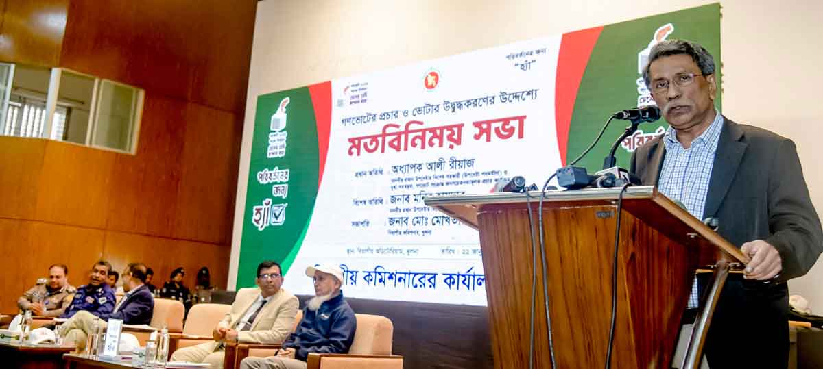 তিনি বৃহস্পতিবার দুপুরে খুলনা বিভাগীয় প্রশাসন আয়োজিত বিভাগীয় কমিশনার কার্যালয়ের অডিটোরিয়ামে গণভোটের প্রচার ও ভোটার উদ্বুদ্বকরণের উদ্দেশ্যে মতবিনিময় সভায় প্রধান অতিথির বক্তৃতায় এসব কথা বলেন।